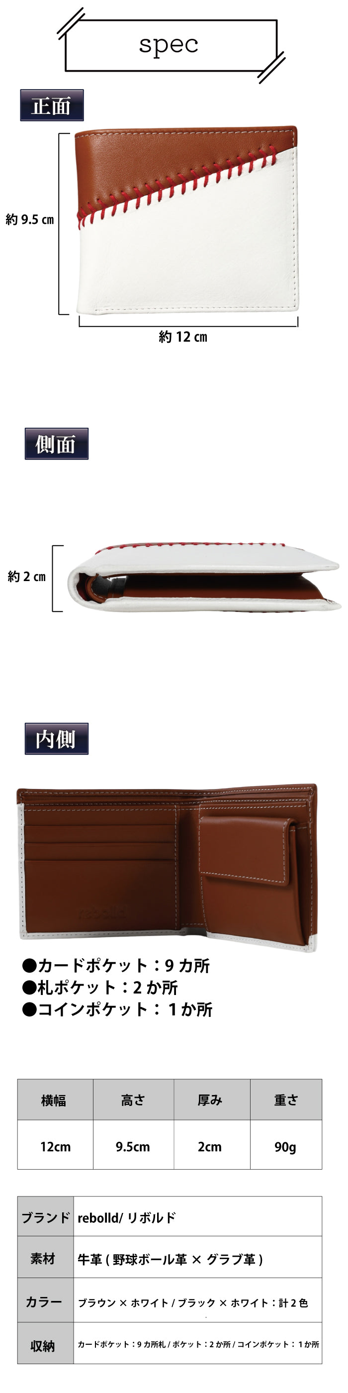 こちらの商品は、野球ボール革とグラブ革の2種類の牛革を使用しており、それぞれの革を丁寧に組み合わせて作った二つ折りの革財布となっております。