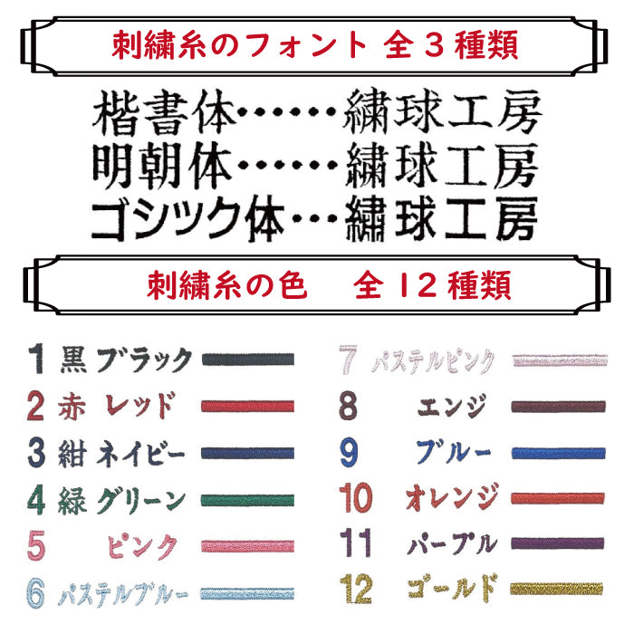 刺繍糸の色は12色からお選び下さい。1行目と2行目は別の色をお選び頂けます。